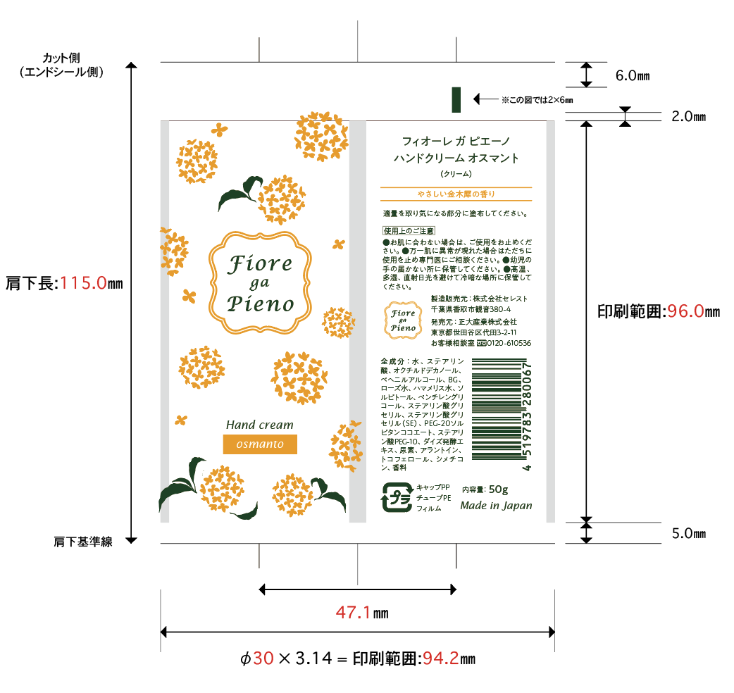 「ハンドクリーム」のチューブデザインをさせていただきました。金木犀の可愛らしいデザインとなりました。