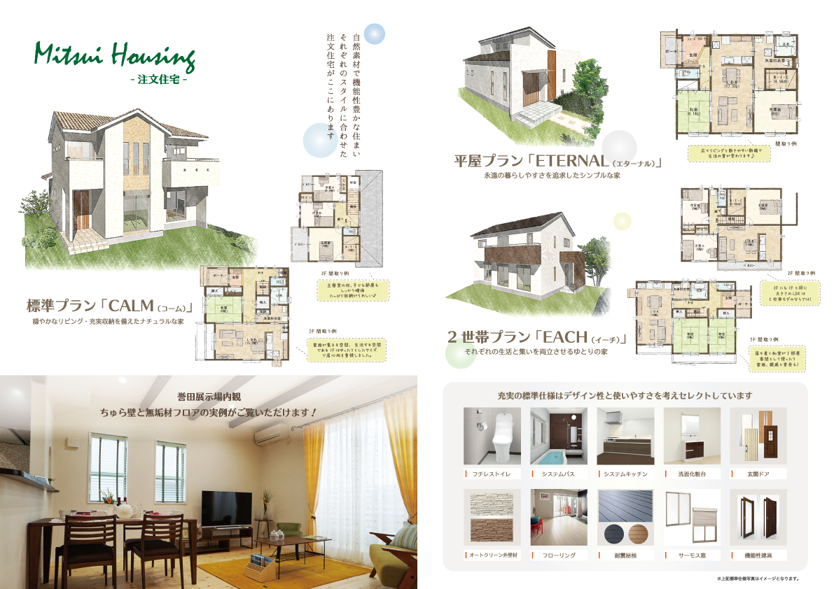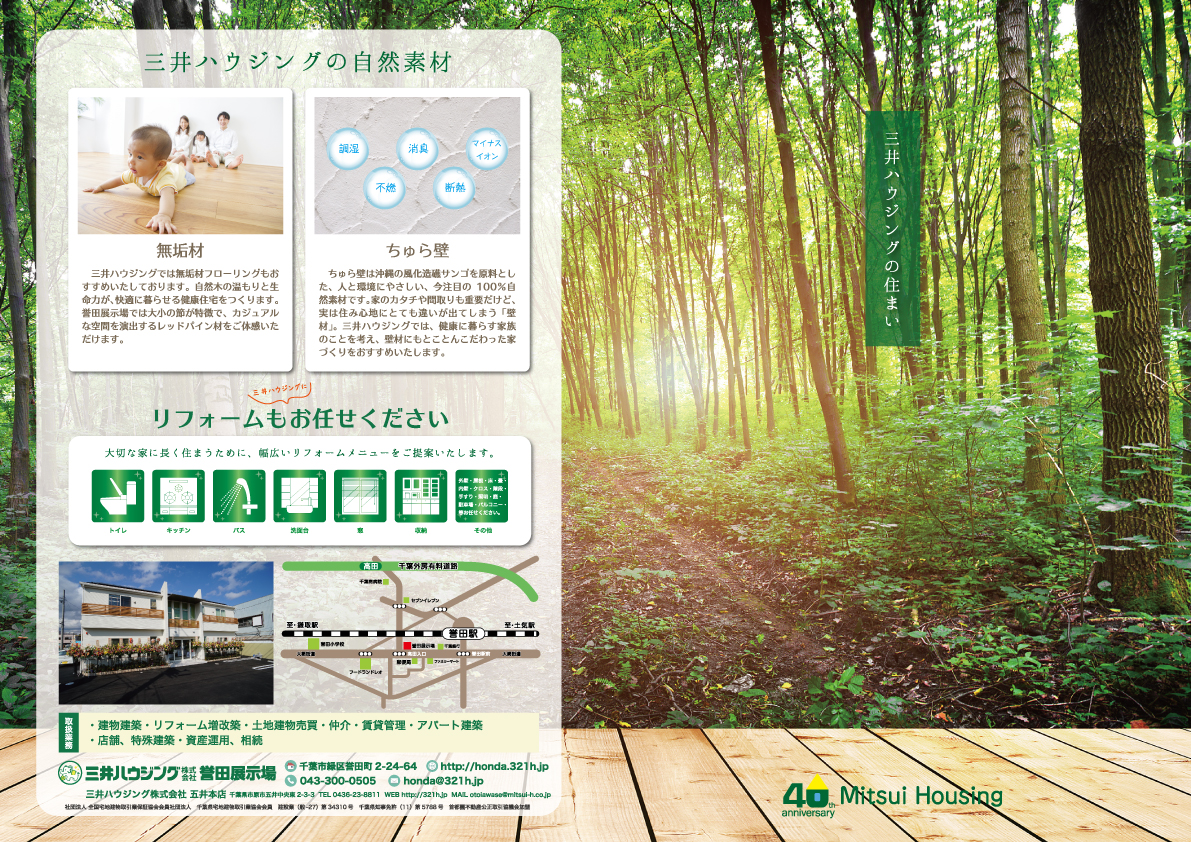 三井ハウジング様のパンフレットを製作いたしました。自然素材を大事にするハウジングメーカー様らしく、森林の表紙は優しさと安心感を醸し出しています。