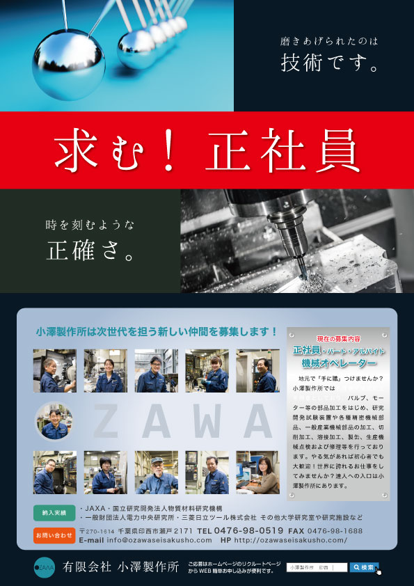 小澤製作所様の求人チラシを製作させていただきました。ネットでの求人活動のほか、紙媒体も使って地域へ告知できるツールとしてチラシを製作し、設置及びフリーペーパーへの折込を実施いたしました。