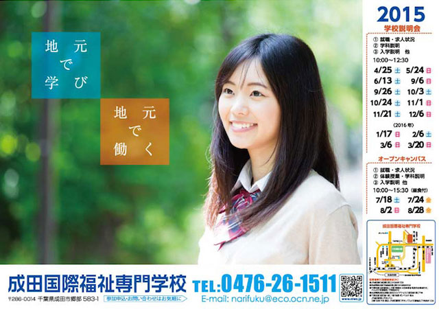 毎年、制作させていただいている学校案内ポスターですが、今年よりモデル写真を含めてリニューアルさせていただきました。透明感のあるモデル、ロケーション写真に「地元で学び」「地元で働く」のコピーをしっかりと伝えることで、明るい未来に向けて一歩踏み出した決意を表現しました。仕上がりはA3及びB1サイズで千葉県内の高校・施設、駅などに掲示されます。