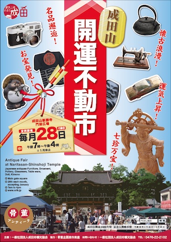 毎月28日に開催する成田山開運不動市では骨董品だけではありません。お洒落なアンティーク品や掘り出し物が所狭しと並んでいます。そこで、もっと幅広いお客様に足を運んでいただけるように、ポスターはポップな印象になるように心がけました。